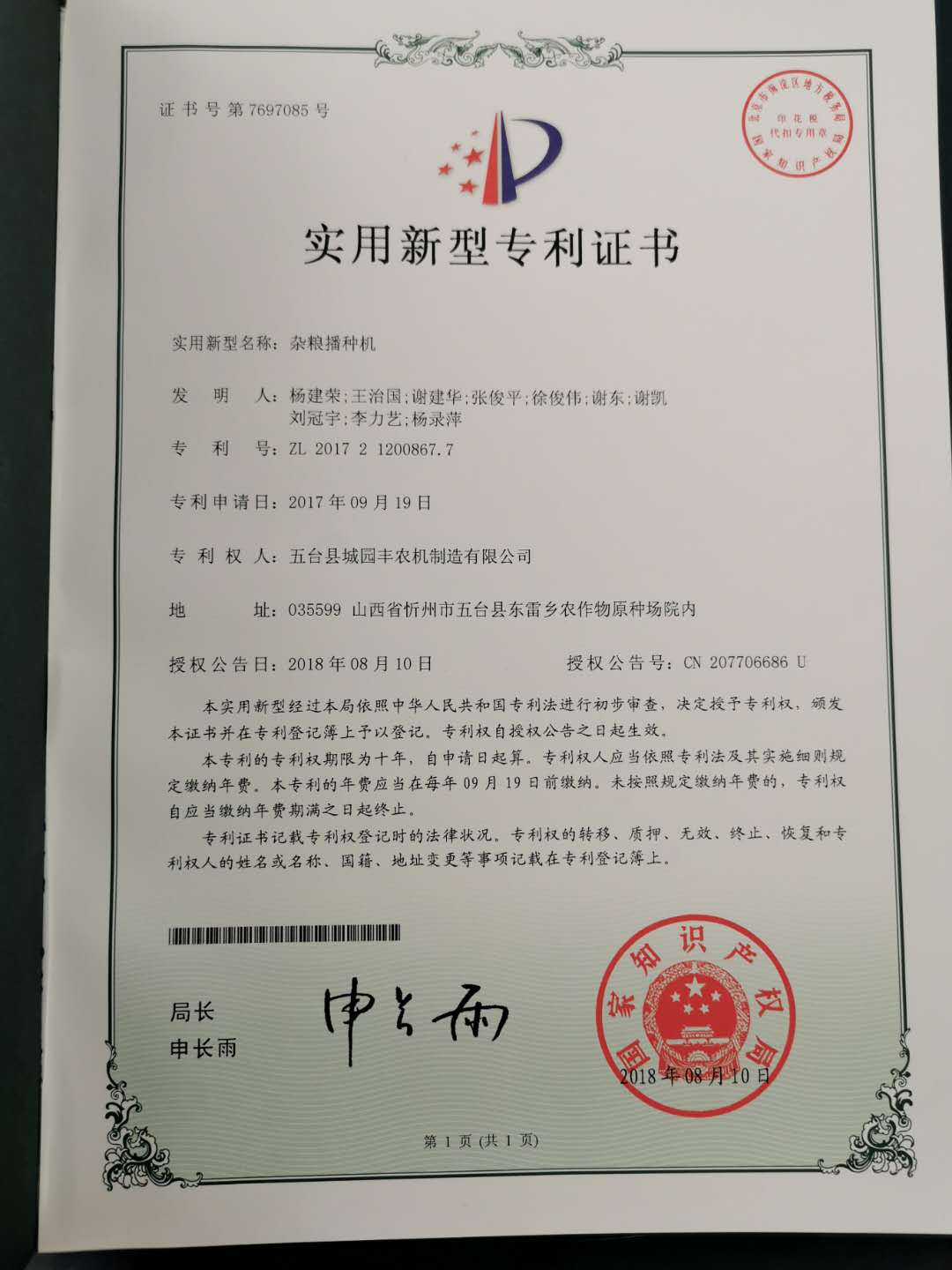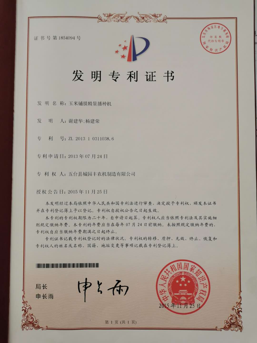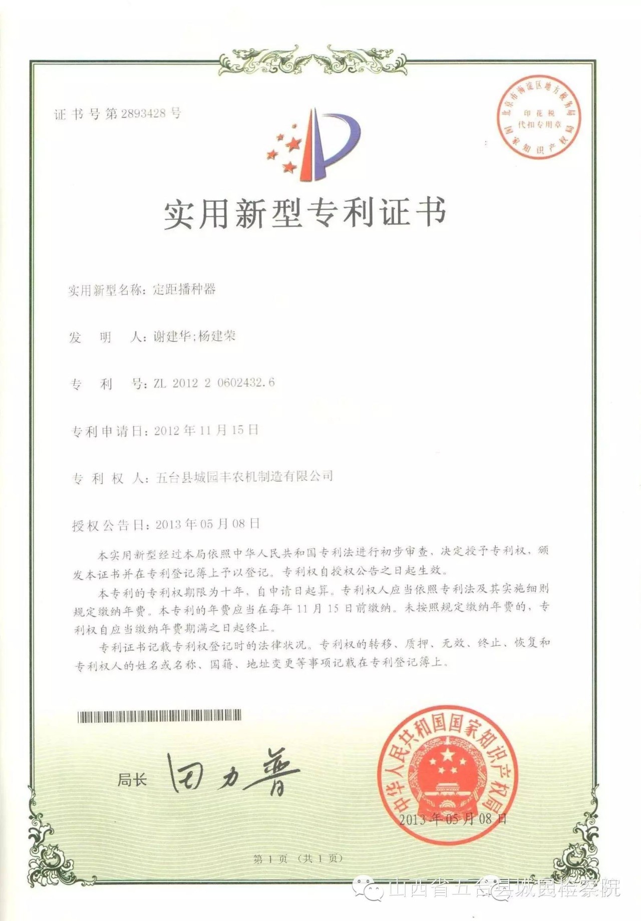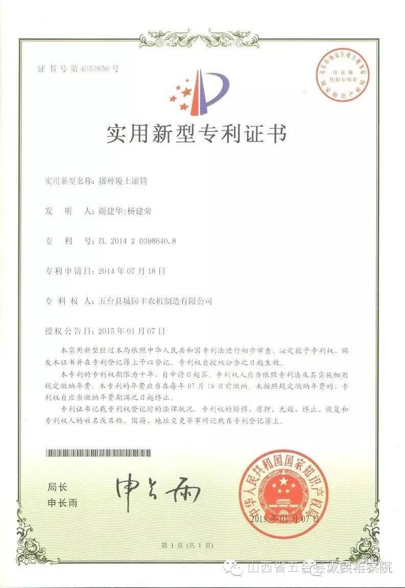 公司的主要產(chǎn)品玉米鋪膜精量播種機的研發(fā)制造推廣獲得了2013年忻州市科學技術(shù)進步獎、一項發(fā)明專利及5項實用新型專利等。