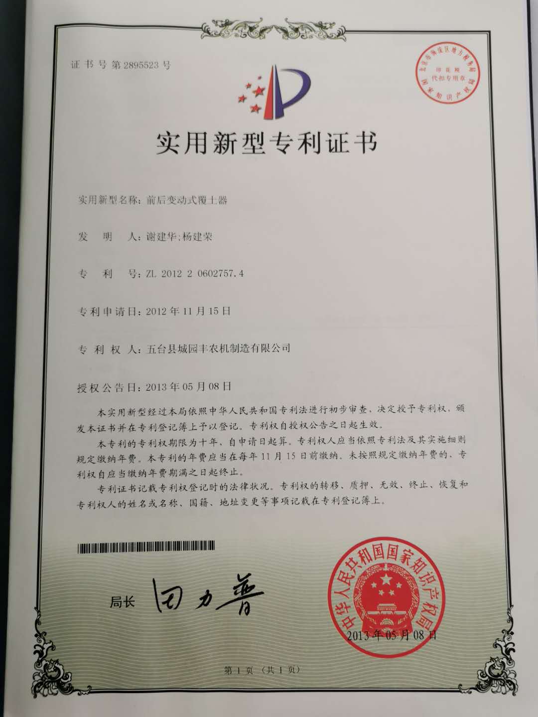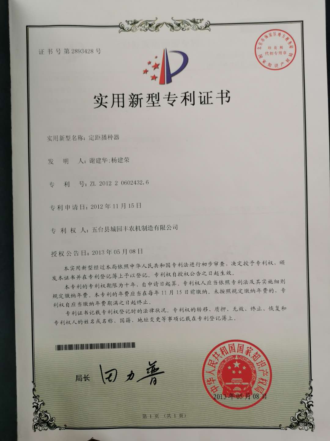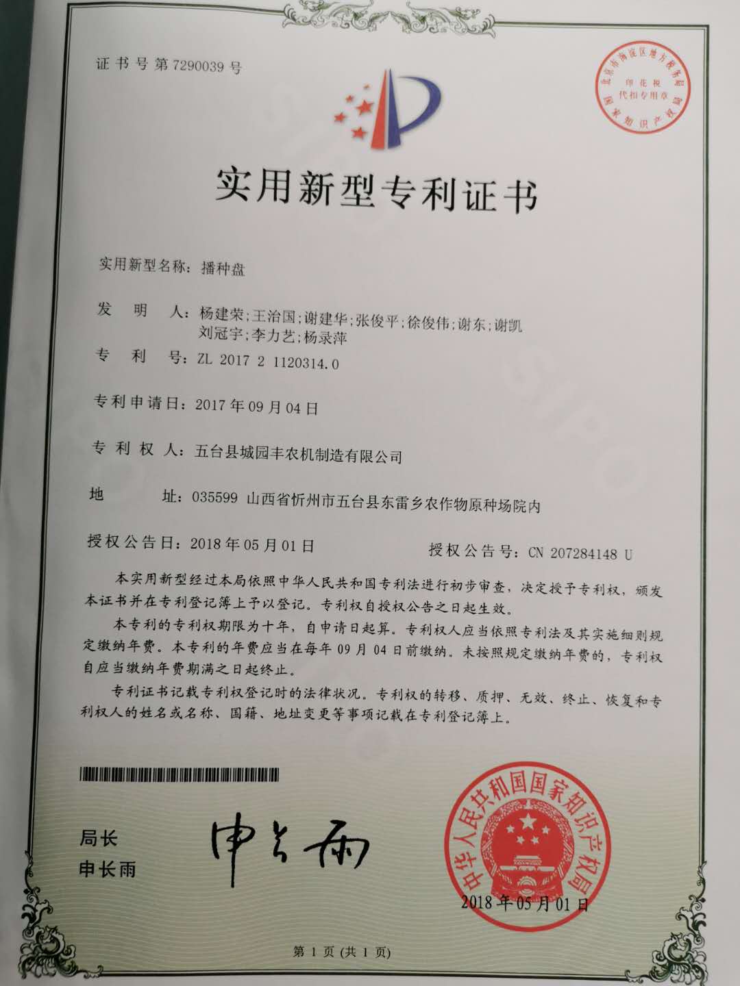 公司的主要產(chǎn)品玉米鋪膜精量播種機的研發(fā)制造推廣獲得了2013年忻州市科學技術(shù)進步獎、一項發(fā)明專利及5項實用新型專利等。